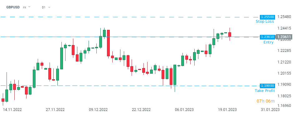 Credit Agricole consiglia di aprire una posizione Short su GBPUSD a 1,2361 con un obiettivo di 1,1900 e un ordine di stop loss collocato a 1,2550. Fonte: xStation5