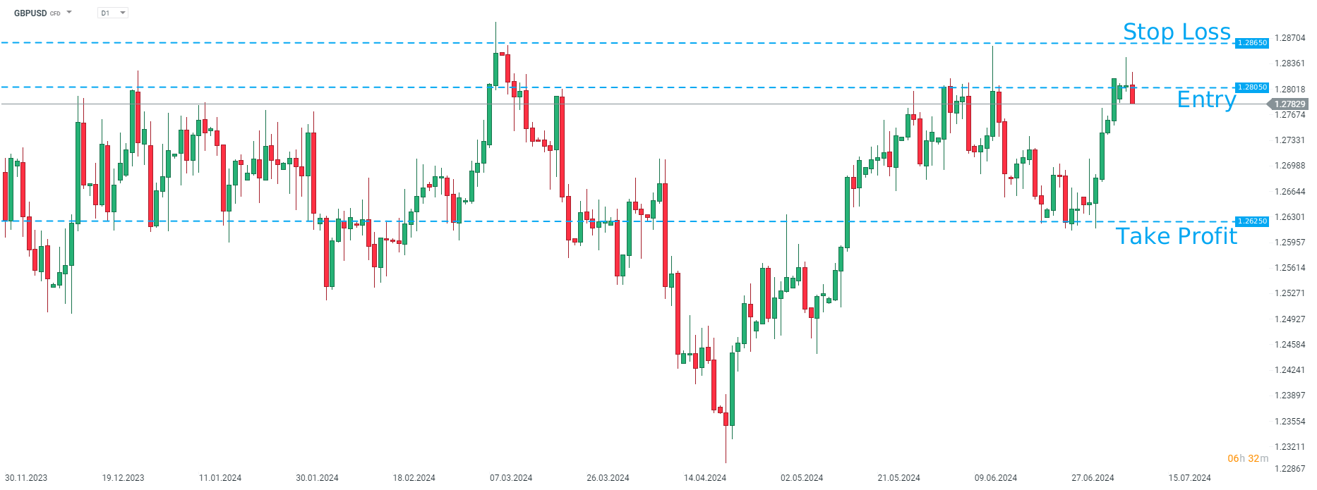 IFR consiglia di assumere una posizione corta su GBPUSD al prezzo di mercato con un obiettivo di 1,2625 e un ordine di stop loss piazzato a 1,2865. Fonte: xStation5