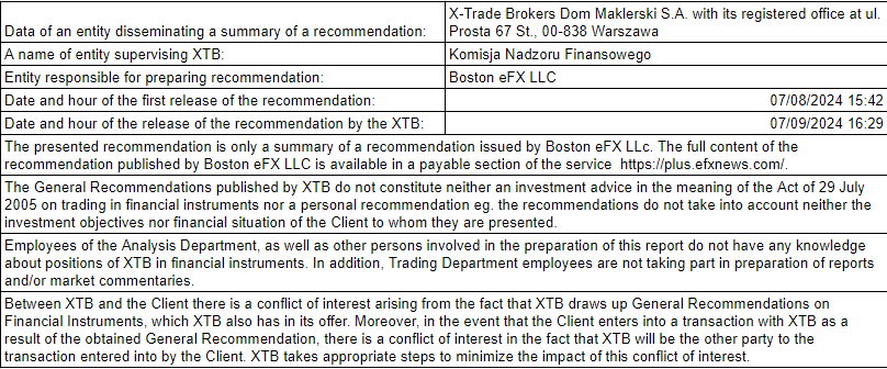Questo materiale è una comunicazione di marketing ai sensi dell'Art. 24, paragrafo 3, della direttiva 2014/65 / UE del Parlamento europeo e del Consiglio, del 15 maggio 2014, relativa ai mercati degli strumenti finanziari e che modifica la direttiva 2002/92 / CE e la direttiva 2011/61 / UE (MiFID II). La comunicazione di marketing non è una raccomandazione di investimento o informazioni che raccomandano o suggeriscono una strategia di investimento ai sensi del regolamento (UE) n. 596/2014 del Parlamento europeo e del Consiglio, del 16 aprile 2014, relativo agli abusi di mercato (regolamento sugli abusi di mercato) e che abroga la direttiva 2003/6 / CE del Parlamento europeo e del Consiglio e direttive della Commissione 2003/124 / CE, 2003/125 / CE e 2004/72 / CE e regolamento delegato (UE) 2016/958 della Commissione, del 9 marzo 2016, che integra il regolamento UE) n. 596/2014 del Parlamento europeo e del Consiglio per quanto riguarda le norme tecniche di regolamentazione per le disposizioni tecniche per la presentazione obiettiva di raccomandazioni di investimento o altre informazioni che raccomandano o suggeriscono una strategia di investimento e per la divulgazione di particolari interessi o indicazioni di conflitti di interessi o qualsiasi altra consulenza, anche nell'ambito della consulenza sugli investimenti, ai sensi della legge sugli strumenti finanziari del 29 luglio 2005 (ad es. Journal of Laws 2019, voce 875, come modificata). La comunicazione di marketing è preparata con la massima diligenza, obiettività, presenta i fatti noti all'autore alla data di preparazione ed è priva di elementi di valutazione. La comunicazione di marketing viene preparata senza considerare le esigenze del cliente, la sua situazione finanziaria individuale e non presenta alcuna strategia di investimento in alcun modo. La comunicazione di marketing non costituisce un'offerta di vendita, offerta, abbonamento, invito all'acquisto, pubblicità o promozione di strumenti finanziari. XTB S.A. non è responsabile per eventuali azioni o omissioni del cliente, in particolare per l'acquisizione o la cessione di strumenti finanziari. XTB non si assume alcuna responsabilità per qualsiasi perdita o danno, anche senza limitazione, eventuali perdite, che possono insorgere direttamente o indirettamente, intrapresa sulla base delle informazioni contenute in questa comunicazione di marketing. Nel caso in cui la comunicazione di marketing contenga informazioni su eventuali risultati relativi agli strumenti finanziari ivi indicati, questi non costituiscono alcuna garanzia o previsione relativa ai risultati futuri. Le prestazioni passate non sono necessariamente indicative dei risultati futuri, e chiunque agisca su queste informazioni lo fa interamente a proprio rischio.
