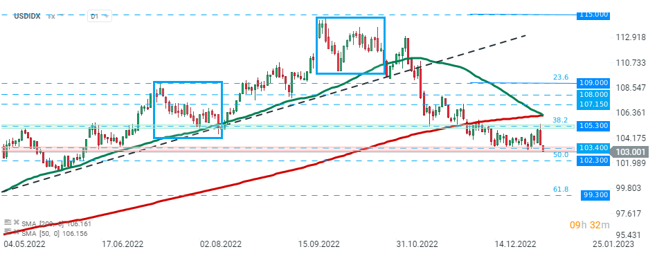 USDIDX - l'indice del dollaro si è ritirato bruscamente la scorsa settimana e ha superato il supporto principale a 103,40, che è riuscito a respingere il prezzo diverse volte in passato. Se la pressione di vendita si intensifica e viene superato il supporto successivo a 102,30, i ribassi potrebbero continuare ulteriormente verso il livello psicologico di 100,00. (linea rossa). Ciò potrebbe formare una "croce della morte" ribassista che a volte può precedere una brusca mossa al ribasso. Fonte: xStation5