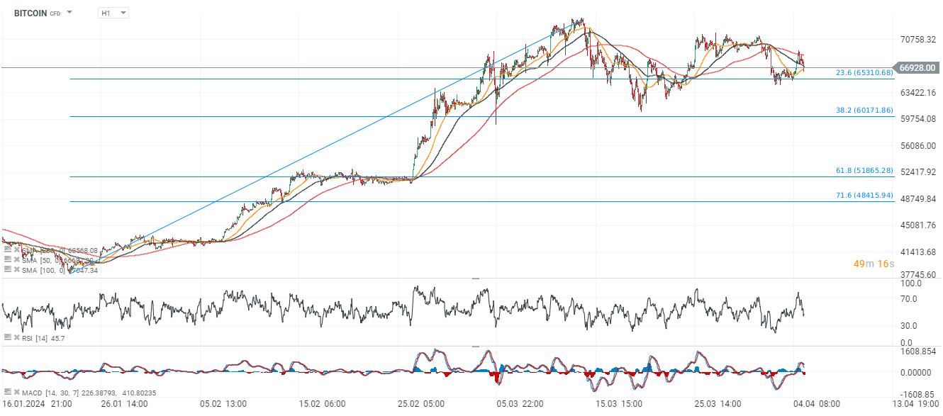 Guardando Bitcoin, nell'intervallo del primo semestre vediamo ancora un'attività di vendita significativa nell'area $ 69.000 - $ 70.000. Una zona di supporto che vale la pena tenere d’occhio è il ritracciamento di Fibonacci a 23,6 dell’onda al rialzo di gennaio 2023 a 65.000 dollari. Un breakout al di sotto di questa zona potrebbe suggerire un nuovo test dei 60.000$. D’altro canto, un breakout sopra i 71.000$ potrebbe segnalare un ritorno della domanda pre-Hallving. Mancano circa 11 giorni a un evento significativo che limiterà ulteriormente l'offerta. La chiave sarà cosa faranno gli ETF per allora, e se il sentiment di Wall Street riuscirà a migliorare rapidamente, dopo i cali di ieri guidati dal dollaro, dal petrolio e dalle tensioni geopolitiche.
