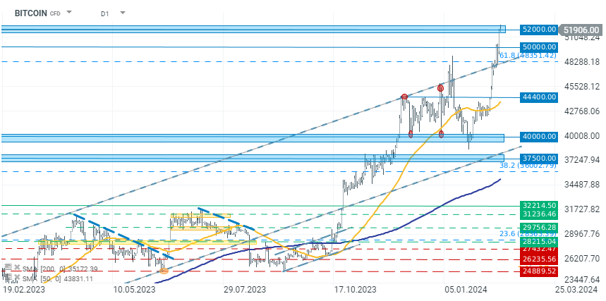 Bitcoin ha registrato un rialzo notevole negli ultimi giorni e nella prima parte della giornata di oggi il prezzo del Bitcoin ha superato per la prima volta il livello dei 52.000 dollari. La zona tra 50.000 e 52.000 dollari rappresenta un livello di resistenza significativo, quindi superarlo potrebbe portare a una continuazione dinamica del movimento. Il principale fattore per il rialzo è stato il raggiungimento di nuovi massimi sugli indici di Wall Street, le preoccupazioni degli investitori circa le condizioni delle banche regionali e nuovi afflussi negli ETF.