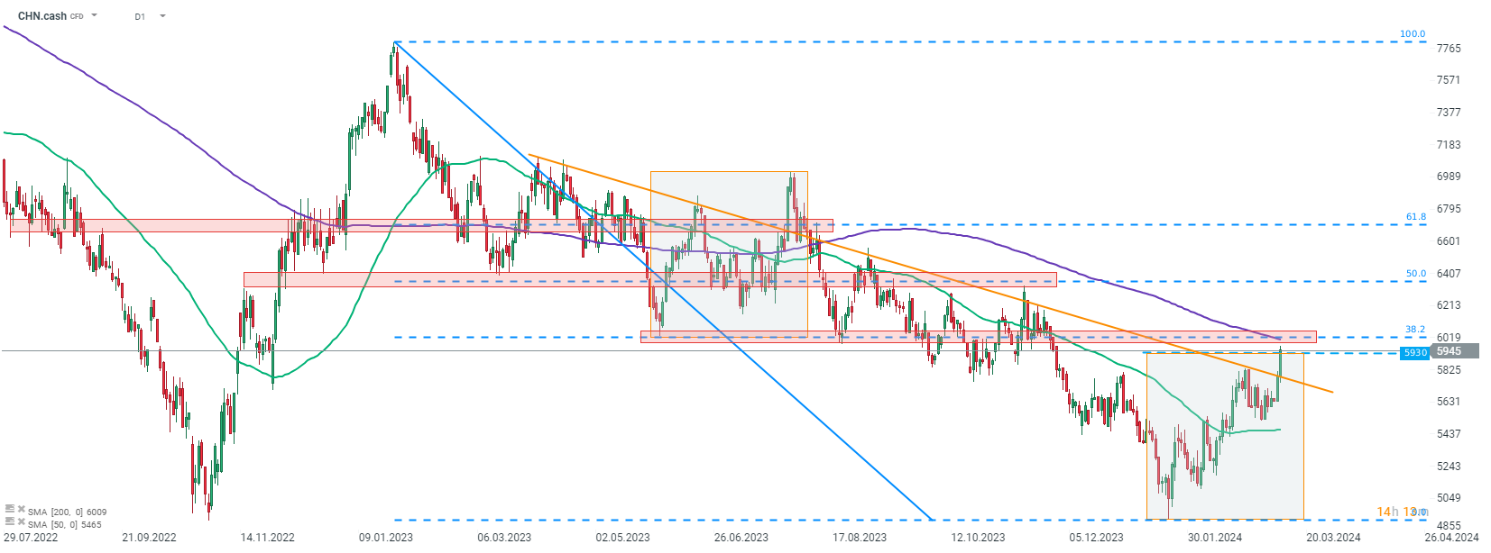 Dando un'occhiata al grafico CHN.cash D1, possiamo vedere che l'indice si sta avvicinando a una zona di resistenza nell'area di 6.000 punti, contrassegnata dalla media mobile di 200 sessioni (linea viola) e dal 38,2% del ritracciamento del calo iniziato all’inizio del 2023. Un punto da notare è che l’indice si trova a oltre il 20% dai minimi di fine gennaio 2024, il che significa che è entrato in un territorio di mercato rialzista. Inoltre, CHN.cash ha superato oggi i 5.930 punti, un livello che segna il limite superiore della struttura Overbalance. Una movimento oltre questo ostacolo è un altro segno di un’inversione di tendenza rialzista su questo mercato.
