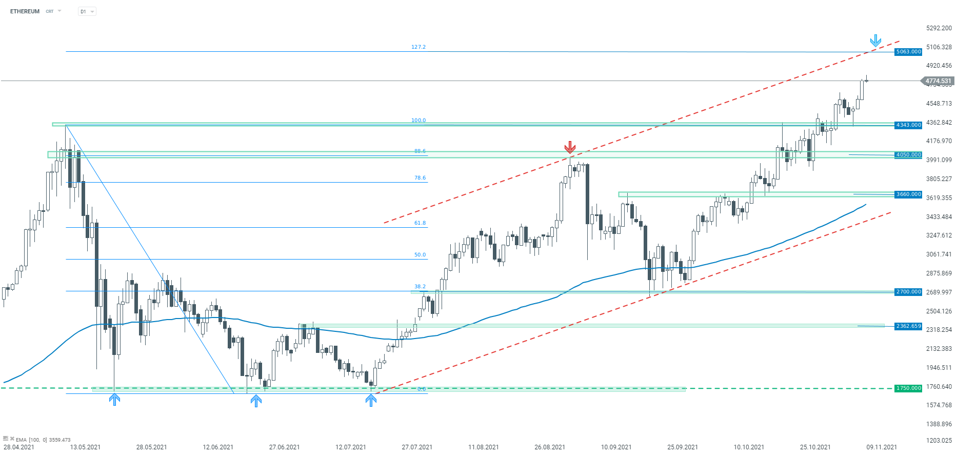 Le criptovalute continuano il movimento al rialzo lanciato durante il fine settimana con Bitcoin che ha raggiunto un nuovo massimo storico superiore a $ 68.000. Litecoin e Caradono guadagnano circa l'8% mentre BitcoinCash e Chainlink sono in rialzo di oltre il 3%. Il rally è stato supportato da alcune notizie fondamentali ottimistiche come il lancio di carte di pagamento collegate a criptovalute da parte di Mastercard in Asia. Anche Ethereum è riuscito oggi a raggiungere un nuovo massimo sopra i 4.800$, ma da allora si è ritirato quasi completamente. Tuttavia, la situazione tecnica sul grafico suggerisce che c'è ancora spazio per estendere il movimento.