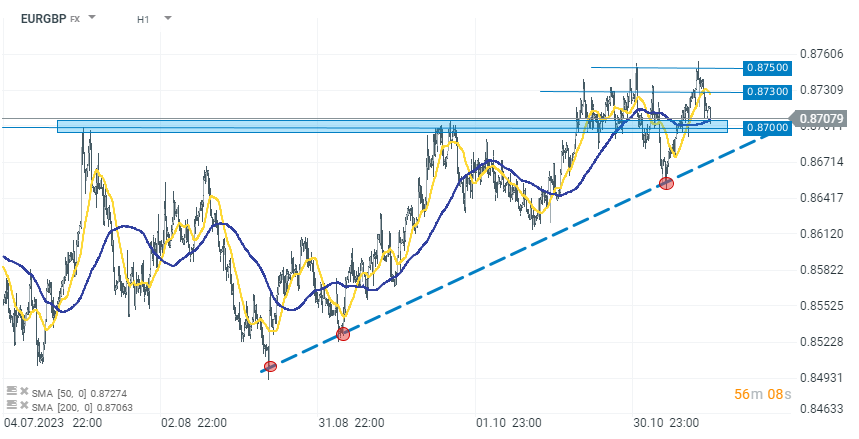 Sul grafico, vediamo che il tasso EURGBP rimane in un trend rialzista. Dopo il recente superamento del livello di 0,8700 e il raggiungimento dei massimi locali di 0,8750, si è verificata una correzione. Attualmente stiamo osservando un test dall'alto della zona 0,8700, che coincide con la media SMA a 200 sessioni. Se i rialzisti riusciranno a difendere questo livello, possiamo aspettarci un altro tentativo di superare 0,8750. Fonte: xStation 5