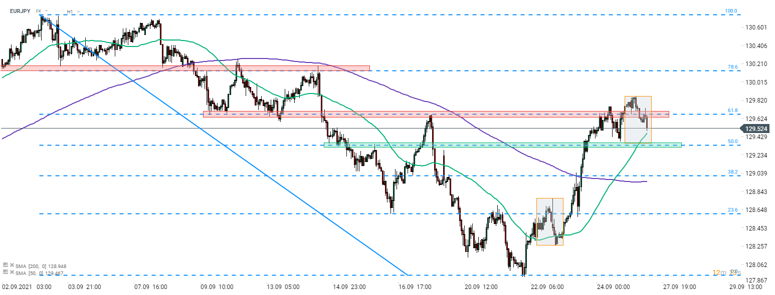 Uno sguardo al grafico EURJPY ci mostra che la coppia ha superato la zona di prezzo contrassegnata dal 61,8% del ritracciamento della mossa al ribasso iniziata all'inizio di settembre. Mentre il calo continua, l'attenzione dei mercati si è spostata sul supporto di breve termine segnato dal 50% del ritracciamento (area 129,35). Si noti che questa zona viene ulteriormente rafforzata dal limite inferiore della geometria del mercato locale e, di conseguenza, costituisce un supporto finale della tendenza al rialzo a breve termine.