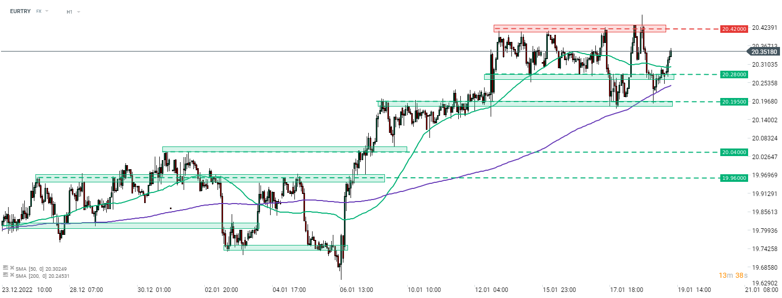 Dando un'occhiata al grafico EURTRY H1, possiamo vedere che la coppia è rimbalzata dalla media mobile a 200 ore (linea viola) e successivamente è salita al di sopra dell'area a 20,28. La zona di resistenza più vicina da tenere d'occhio si trova nell'area 20.42 ed è contrassegnata da massimi locali recenti. Se la CBRT dovesse sorprendere con un taglio dei tassi piuttosto improbabile, la coppia potrebbe saltare rapidamente sopra la suddetta zona 20,42 e puntare verso i massimi storici dalla fine del 2021 nell'area 20,68.
