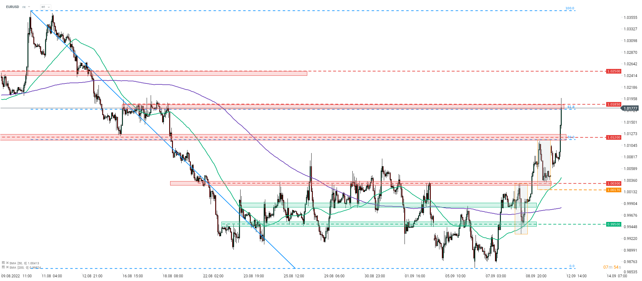 Dando un'occhiata al grafico EURUSD H1, possiamo vedere che la coppia ha superato la zona di resistenza contrassegnata dal 50% del ritracciamento nell'area 1.0120 e ha continuato a salire questa mattina. La coppia ha persino tentato di superare la zona di resistenza compresa tra il 61,8% del ritracciamento del movimento al ribasso di fine agosto e il livello di 1,0185, ma questo movimento è stato fermato leggermente al di sotto di 1,02. Tuttavia, se venisse superata la soglia di 1,0185, potrebbe portare in seguito un movimento verso la prossima potenziale resistenza a 1,0250.