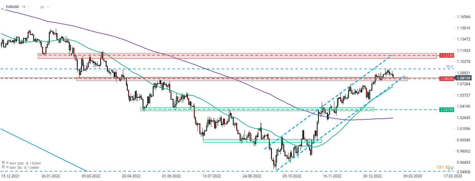 Dando un'occhiata al grafico EURUSD D1, possiamo vedere che la coppia di valute principale ha interrotto il recente movimento dopo aver raggiunto il 50% del ritracciamento di una mossa al ribasso iniziata nel gennaio 2021. La coppia si è ritirata e ora si sta avvicinando a un test di un recente zona di prezzo a 1,08. Tuttavia, questa volta potrebbe essere testato come supporto. Si noti che il limite inferiore del canale al rialzo si trova leggermente al di sotto della zona 1,08 e un movimento oltre questi due supporti tecnici potrebbe preannunciare un movimento al ribasso maggiore.