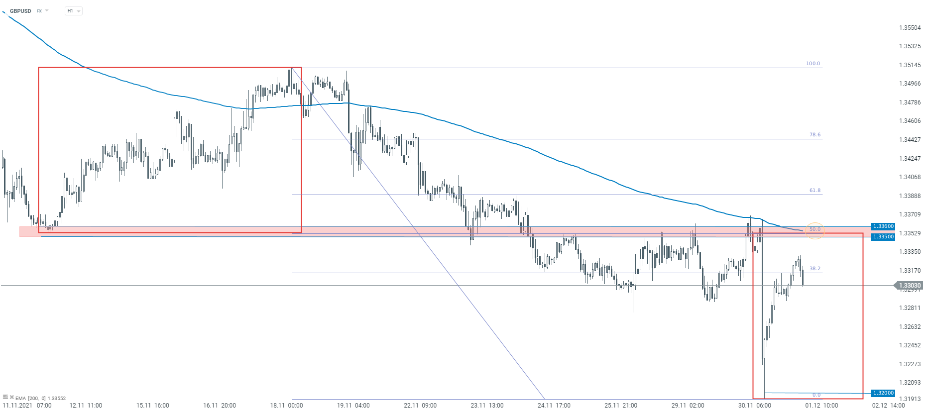 Dando uno sguardo tecnico al grafico GBPUSD H1 possiamo vedere che la coppia si trova in un movimento al ribasso da un po' di tempo. Tuttavia, si sta riprendendo da un forte calo avvenuto venerdì la scorsa settimana. La zona di resistenza chiave si trova nell'area 1.3350-1.3360. L'area è contrassegnata dal limite superiore dell'overbalance, dal 50% del ritracciamento, dalle precedenti reazioni di prezzo e dall'EMA a 200 periodi. Se venisse superata quest'area invaliderebbe lo scenario ribassista e renderebbe le prospettive più rialziste mentre se non riuscisse a estendere il movimento potrebbe aprire la strada a un pullback verso i minimi recenti.