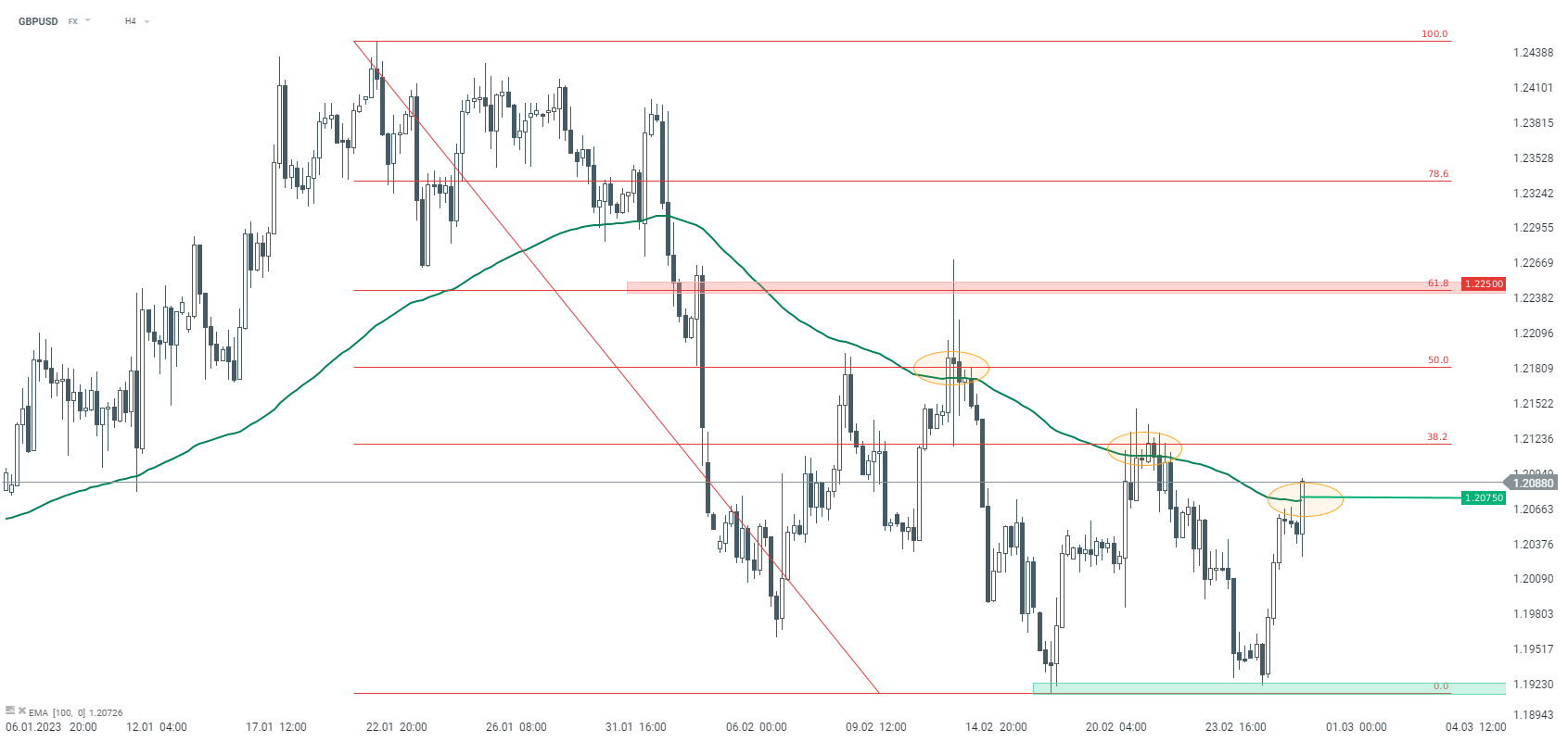 Dando un'occhiata al grafico GBPUSD H4, possiamo vedere che oggi la coppia sta superando la media mobile esponenziale a 100 periodi. I prossimi giorni potrebbero essere cruciali poiché i precedenti breakout al di sopra della suddetta media mobile si sono rivelati falsi e hanno segnato nuovi massimi inferiori nell'attuale struttura discendente. Tuttavia, Sunak potrebbe fornire un sostegno per un movimento duraturo se riuscisse a ottenere il sostegno sul "Windsor Framework" in Irlanda del Nord.