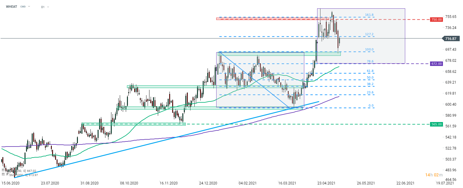 Dando uno sguardo al grafico WHEAT, possiamo vedere che il calo è stato interrotto nell'area 690, dove si possono trovare i precedenti massimi locali. Il prezzo ha iniziato a recuperare più tardi e ora si avvicina al 127,2% del ritracciamento esterno della correzione iniziata a fine gennaio, che coincide anche con i minimi locali di fine aprile. Superare questo ostacolo potrebbe portare a un nuovo test dei massimi recenti nell'area 750. D'altra parte, se il movimento ribassista dovesse continuare, il supporto chiave può essere trovato al 78,6% del ritracciamento (area 672), dove si trova il limite inferiore della struttura Overbalance.