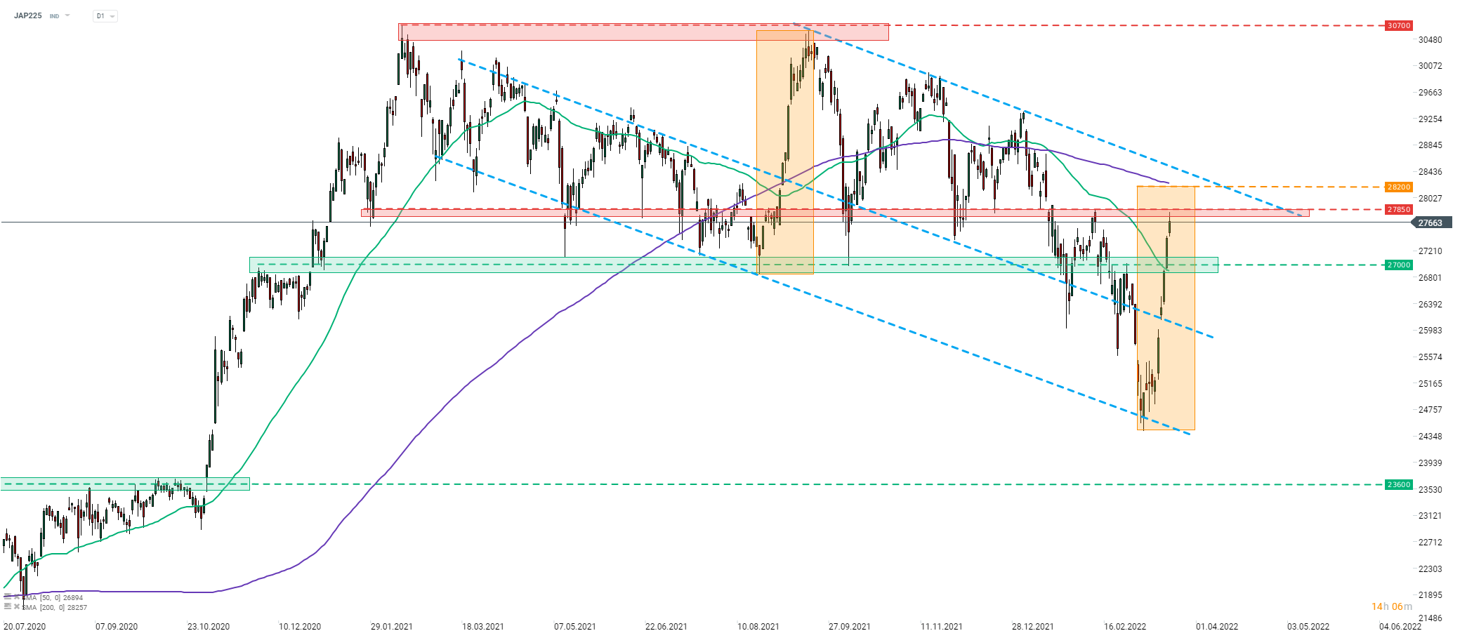Dando un'occhiata al grafico Nikkei giornaliero D1 (JAP225), possiamo vedere che l'indice è stato per lo più in ribasso dalla fine del 2020. All'inizio di marzo 2022 è stato effettuato un test del limite inferiore di un ampio canale al ribasso, ma non è riuscito a superarlo. È iniziata una mossa di ripresa e JAP225 ha guadagnato oltre il 13% nelle due settimane successive. I due livelli di resistenza da tenere d'occhio sono la zona di resistenza di 27.850 punti, che viene testata oggi, e il limite superiore di una struttura di Overbalance a 28.200 punti. Si noti che il limite superiore del canale si trova leggermente al di sopra di 28.200 punti.