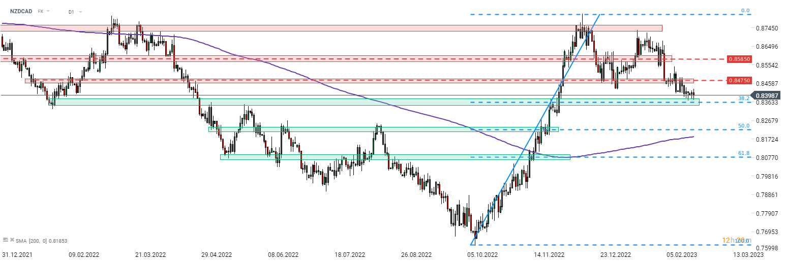 Dando un'occhiata al grafico NZDCAD D1, possiamo vedere che la coppia ha recentemente interrotto il movimento al rialzo e ha iniziato a ritirarsi. La coppia è scesa al livello più basso dalla fine di novembre 2022, ma sembra che il fondo dell'attuale impulso al ribasso possa essere stato trovato al 38,2% del ritracciamento nell'area di 0,8350. La coppia ha faticato a scendere al di sotto di quest'area negli ultimi giorni e se RBNZ dovesse continuare con un aumento del tasso di 50 punti base e impegnarsi nella sua posizione restrittiva, potrebbe iniziare una mossa di ripresa.