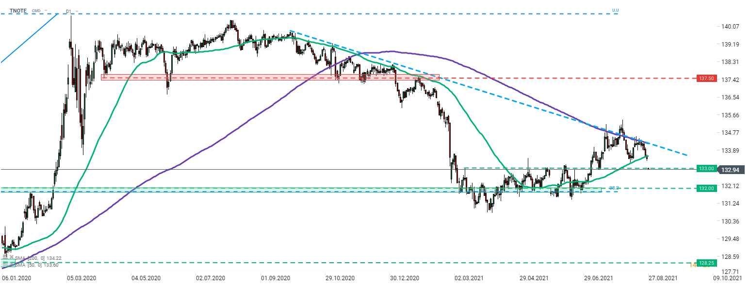 Il discorso di Powell alle 15:00 BST è un evento chiave per i trader TNOTE oggi. I commenti hawkish del presidente della Fed potrebbero innescare il sell-off sul mercato obbligazionario e spingere i tassi di mercato più in alto a loro volta. Tuttavia, questo non è lo scenario di base. Ci si aspetta che Powell usi la recente ripresa dei nuovi casi di Delta come argomento per mantenere la politica allentata ancora per un po'. Tuttavia, i commenti falchi di altri membri della Fed, come per esempio Kaplan ieri, segnalano che il gruppo di banchieri centrali a favore dei rialzi dei tassi sta crescendo. Questa è anche la ragione più probabile dietro il calo del TNOTE di oggi all'inizio del trading.
