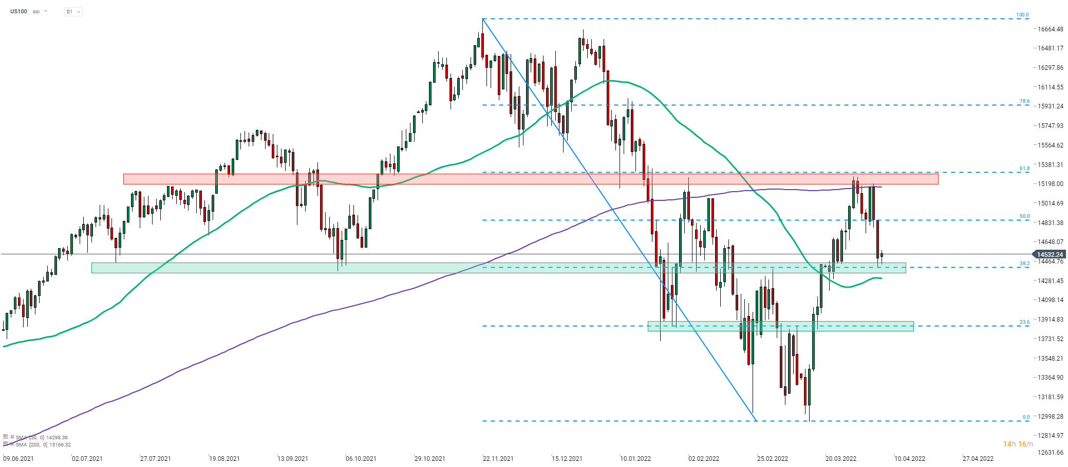 Un forte messaggio inviato dai verbali del FOMC ha esercitato una certa pressione sugli indici. Il settore tecnologico, considerato il più vulnerabile alle variazioni del livello dei tassi, ha subito un colpo smisurato. Dando un'occhiata al grafico Nasdaq-100 (US100) D1, possiamo vedere che l'indice è sceso dopo che e apparso un pattern a doppio massimo vicino alla media mobile a 200 sessioni (linea viola). L'indice è sceso al 38,2%, ritracciando un calo lanciato a novembre 2021 (14.400 punti) e quindi ha raggiunto il range di un breakout dal modello sopra menzionato. Molto dipenderà ora dalla reazione dell'indice all'area di 14.400 punti. In caso di un calo al di sotto di esso, i trader dovrebbero concentrarsi sul supporto successivo al 23,6% del ritracciamento poiché il test e il recupero da quest'area porterebbero un lato destro al pattern testa e spalle inverso con scollatura al 61,8% del ritracciamento.