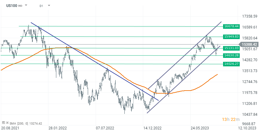 Solo due giorni fa abbiamo scritto che il principale indice delle società tecnologiche, il Nasdaq 100, stava cercando di superare il livello dei 15.000 punti. Dopo una forte correzione di quasi l'8,0% iniziata alla fine di luglio, venerdì scorso l'indice è rimbalzato con guadagni significativi. All'inizio di questa settimana, l'umore nel settore tecnologico ha iniziato a migliorare e nella sessione di ieri l'indice ha guadagnato uno sbalorditivo 1,60%, tornando nuovamente al di sopra della linea di supporto del trend rialzista. Dopo la chiusura, sono stati pubblicati i risultati di Nvidia, consolidando ulteriormente il sentimento ottimista per il Nasdaq 100. Nonostante il ritorno alla crescita euforica, gli investitori dovrebbero rimanere concentrati. Oggi inizia il simposio di Jackson Hole, in cui i leader di mercato e i banchieri dovrebbero segnalare la fine del ciclo di rialzi dei tassi di interesse. La realtà potrebbe rivelarsi ancora una volta diversa. I recenti commenti dei membri della Federal Reserve e la posizione della Fed suggeriscono che la Fed potrebbe non cedere così facilmente, soprattutto perché il mercato del lavoro rimane forte e gli ultimi dati sull'inflazione erano più alti di quelli precedenti, 3,2% su base annua contro 3,0. % anno dopo anno.