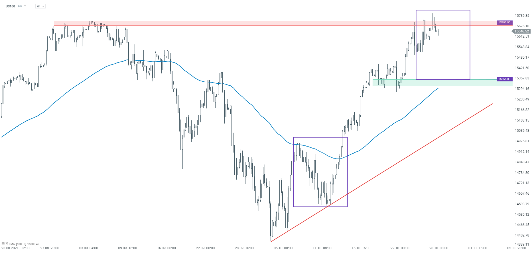 Nasdaq-100 (US100) è riuscito a raggiungere un nuovo massimo storico ieri, ma non è riuscito a sostenere la mossa. L'indice non è riuscito a superare per la terza volta la zona di resistenza di 15.700 punti. Il rischio di una correzione al ribasso è in aumento e se dovessimo vederne una, il primo importante supporto da tenere d'occhio si trova nell'area di 15.350 punti. Questa zona è supportata dal limite inferiore della geometria del mercato, dalle precedenti reazioni di prezzo e dall'EMA a 100 periodi sull'intervallo H4.