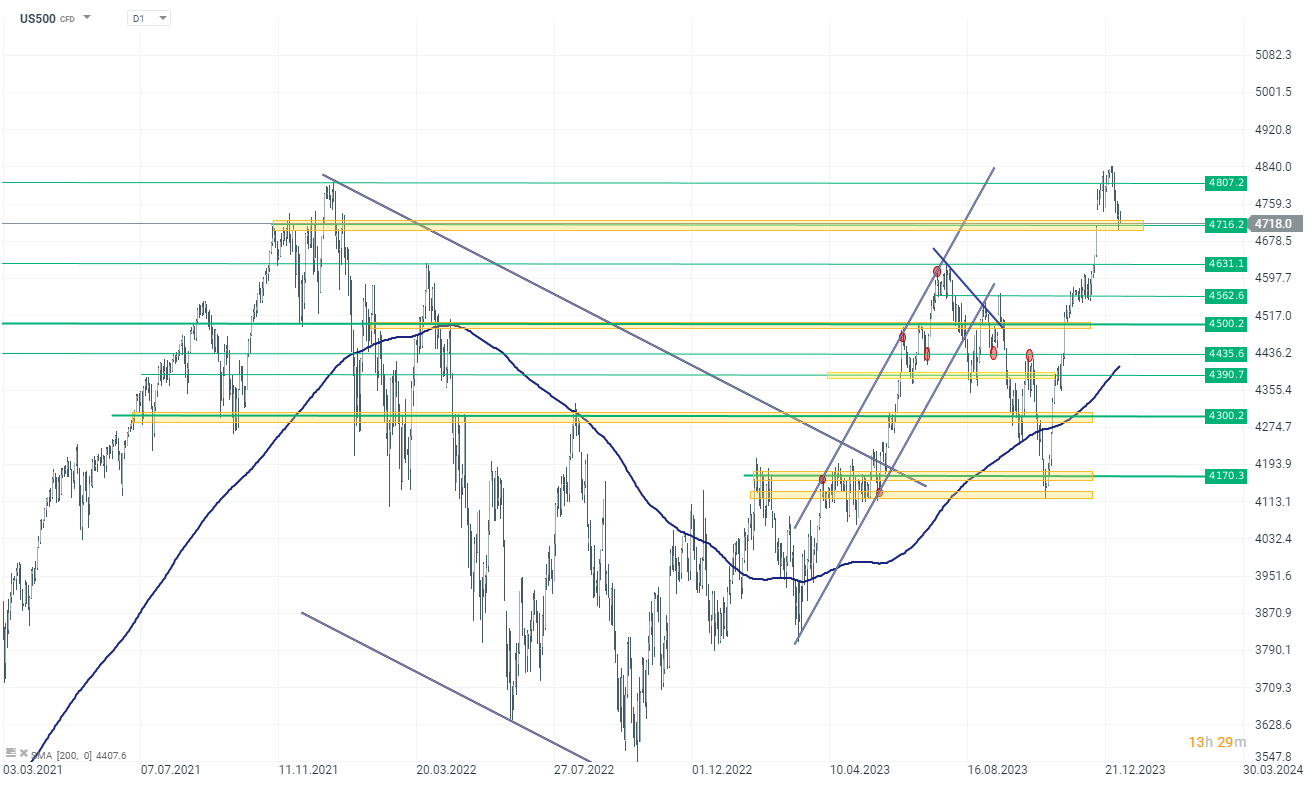 Dopo la pubblicazione dei dati, US500 ha testato la zona di supporto intorno a 4700 USD. Tuttavia, l'indice è riuscito a invertire parte del calo alla chiusura della sessione di venerdì. Oggi i ribassi continuano e l'indice sta testando ancora una volta l'area intorno ai 4700-4730 punti. Se l'attuale livello di supporto viene superato, possiamo aspettarci un movimento al ribasso verso i 4630 punti circa. Questa zona è dove si trova il massimo locale dell'anno precedente. D’altro canto, l’attuale ribasso ha colmato il gap al rialzo formatosi il 13 dicembre 2023. In teoria, ciò crea la possibilità di continuare il movimento al rialzo. In questo caso vale la pena tenere d'occhio il livello dei 4800 punti.