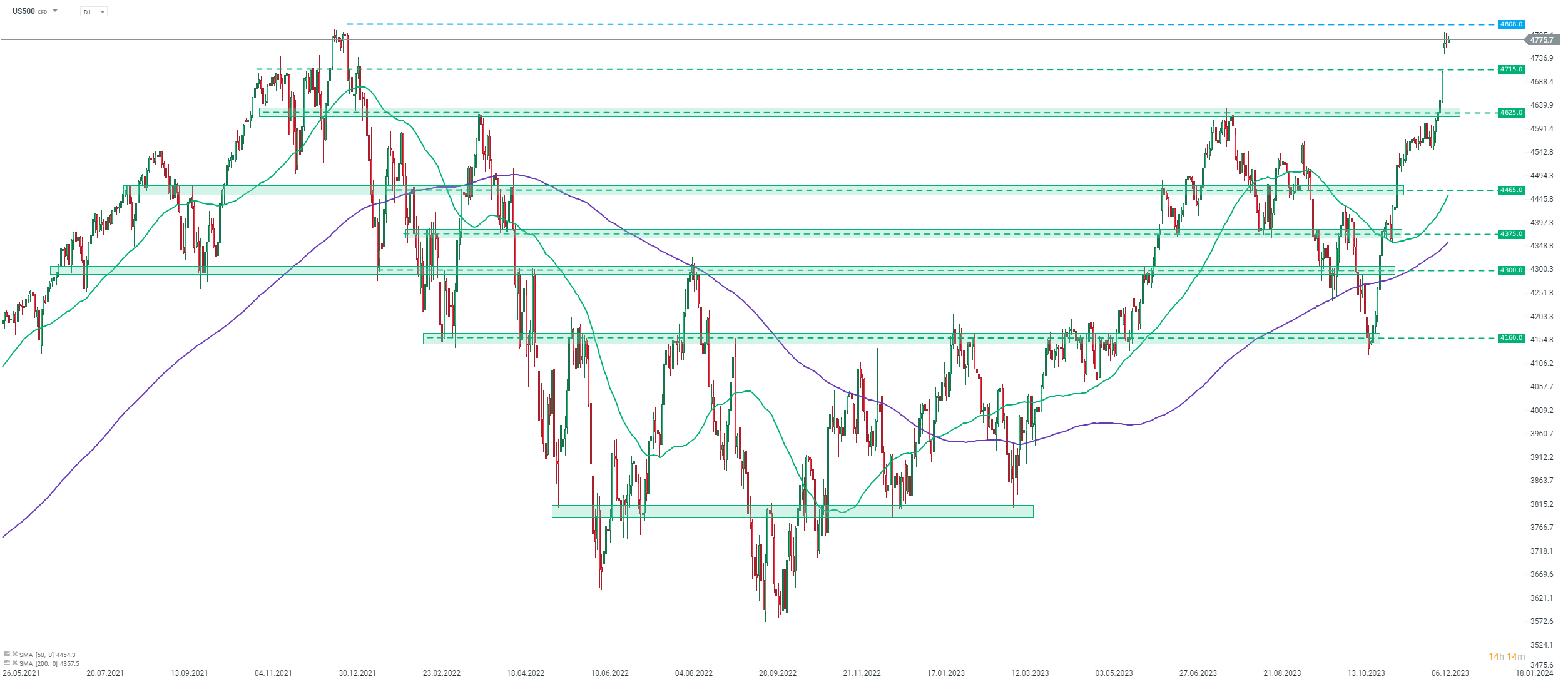 Dando uno sguardo al grafico US500 D1, possiamo vedere che mentre l'indice ha terminato la sessione di venerdì in ribasso, questo calo può essere appena notato sul grafico. L'US500 continua a essere scambiato leggermente al di sotto dei 4.800 punti, dove si possono trovare i massimi storici. Questo è anche un livello chiave di resistenza a breve termine da tenere d’occhio. D'altra parte, la situazione dovesse cambiare, il primo supporto da tenere d'occhio può essere trovato nell'area di 4.715 punti, dove si possono trovare la precedente reazione e il limite inferiore del gap di prezzo rialzista post-FOMC.