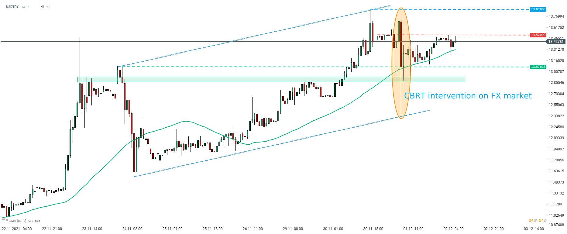 Dando un'occhiata al grafico USDTRY H1, possiamo vedere che la coppia ha avuto movimenti enormi ieri quando è intervenuta la CBRT. Tuttavia, ha rapidamente recuperato la maggior parte delle perdite. Questa mattina USDTRY ha testato l'area di oscillazione a 13,52, ma finora non è riuscito a superarla. Tuttavia, la media mobile a 50 ore (linea verde) ha agito da supporto e potrebbe verificarsi un altro test dell'area 13,52.