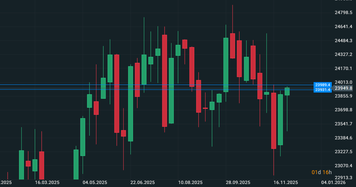 Mercati azionari che erano pronti a testare le aree dei massimi dei giorni scorsi e delle precedenti settimane e che di fatto rimangono a ridosso dei livelli di test senza vedere alcun movimento di reazione. Questo vale per il Dax, che rompe i massimi della scorsa settimana e va a testare quelli di due settimane fa, oppure il Nikkei che rompe i massimi delle scorse settimane e torna indietro al di sotto dei massimi di due settimane fa. In sostanza, movimenti poco interessanti per i mercati che probabilmente attendono la decisione della Fed della prossima settimana, il 10 dicembre si attende infatti un taglio dei tassi con una probabilitá dell'87% pertanto i mercati potrebbero vedere un aumento della volatilitá rispetto a quanto vediamo attualmente.