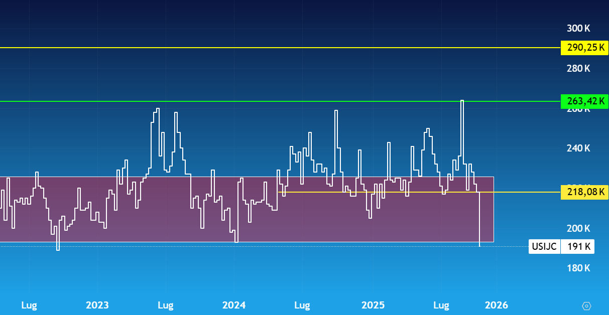 Richieste iniziali di sussidi di disoccupazione ai minimi dal 2022 - Fonte: TradingView