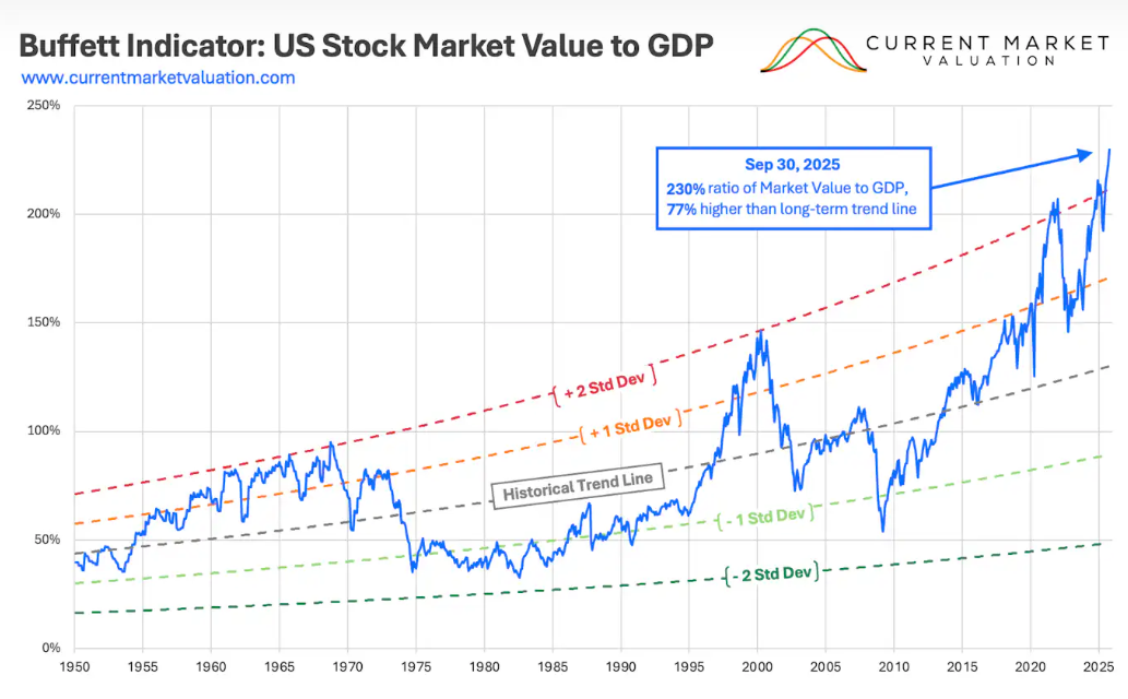 Passando all'analisi fondamentale, l'indicatore ideato da Warren Buffett per misurare il sovrapprezzo del mercato fornisce un altro campanello d'allarme. Questo parametro confronta il valore totale del mercato azionario USA (indice Wilshire 5000) con il PIL statunitense, offrendo una visione di quanto il settore finanziario sia cresciuto rispetto all'economia reale complessiva. Storicamente, un valore superiore al 150% è considerato sintomo di un mercato sopravvalutato. Tale livello fu toccato durante la famigerata bolla delle dotcom del 2000, corrispondente alla seconda deviazione standard. Oggi, il rapporto ha raggiunto circa il 220%, superando di 2,4 volte la deviazione standard. In sostanza, siamo ben oltre i livelli critici visti nel 2000. È cruciale ricordare che, sebbene l'indicatore segnali uno stato di estremo sovrapprezzo, esso descrive la situazione attuale e non è predittivo dei movimenti tecnici imminenti del mercato.