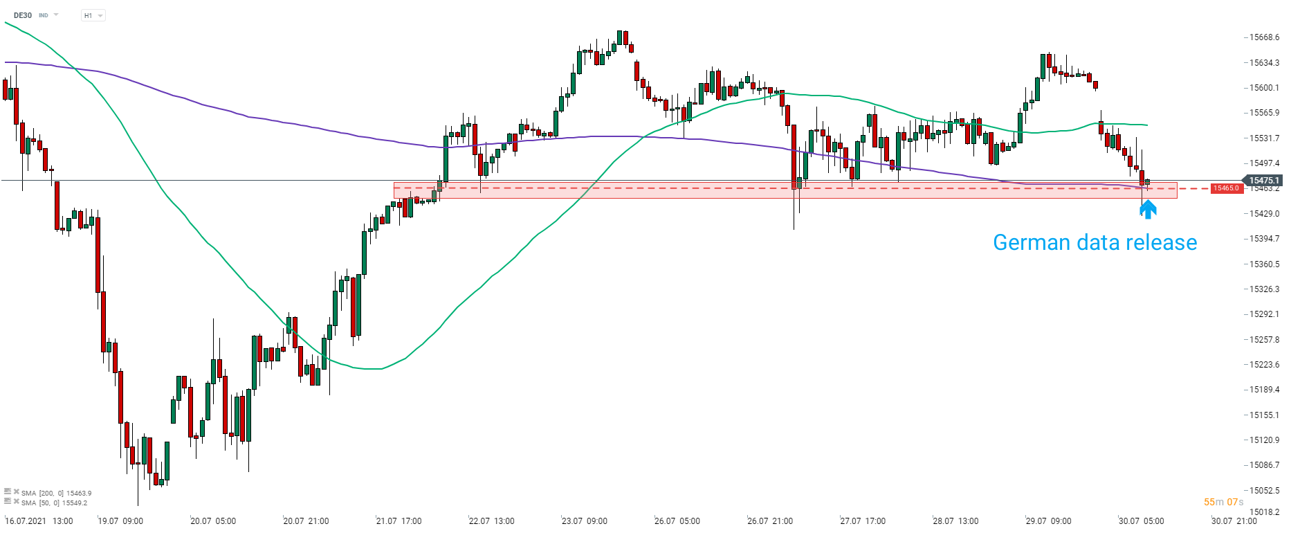 DE30 ha avuto a malapena una reazione alla delusione nei dati del PIL tedesco. L'indice continua ad aggirarsi vicino alla media mobile a 200 ore. Fonte: xStation5