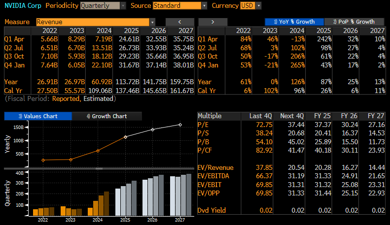 Il mercato stima altri due anni di rapida crescita degli utili di NVIDIA. Allo stesso tempo, il primo trimestre del 2025 è l’ultimo trimestre dell’effetto base basso. Per il prossimo trimestre il mercato prevede ricavi per 26,7 miliardi di dollari. Nelle ultime quattro conferenze, l'azienda ha presentato stime superiori di oltre il 14% rispetto alle aspettative del mercato. Aumenterà le previsioni sulle entrate per il secondo trimestre fiscale del 2025 a circa 27,5 miliardi di dollari? Fonte: Bloomberg Finance LP