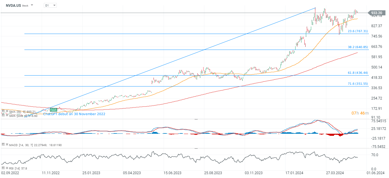 Nvidia (NVDA.US) è la seconda società più grande di Wall Street, ma sicuramente la più attentamente monitorata e in più rapida crescita tra tutte le "large cap" statunitensi, grazie alla sua posizione dominante nel mercato relativo alle soluzioni di intelligenza artificiale. Domani, 22 maggio, dopo la sessione di negoziazione statunitense, la società pubblicherà i risultati per il primo trimestre fiscale 2025 (il calendario fiscale della società è un anno avanti). Pertanto, il rapporto più atteso negli Stati Uniti arriverà in realtà alla “chiusura” della stagione degli utili, aumentando potenzialmente la volatilità sugli indici del mercato azionario e sui titoli delle società tecnologiche. Il mercato delle opzioni stima una volatilità dei prezzi azionari di circa l'8,5% dopo il rapporto, aspettandosi una reazione leggermente meno violenta rispetto ai trimestri precedenti.