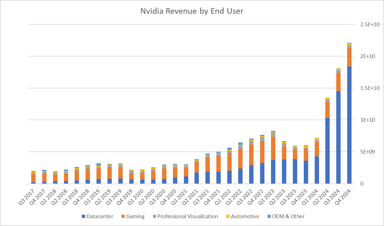 - Poiché le aziende potrebbero affrettarsi a implementare l'intelligenza artificiale, e in questa fase i concorrenti di Nvidia sono ancora "ai blocchi" (AMD è probabilmente il più vicino); l’azienda potrebbe beneficiare di margini più elevati e di ordini in crescita potenzialmente esponenziale, riflettendo una “corsa agli armamenti” per un’intelligenza artificiale e un potere più potenti, condizionando le prestazioni dei modelli linguistici e dell’intelligenza artificiale generativa.