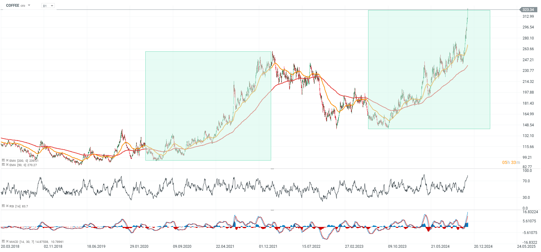 I contratti futures sul caffè Arabica sono aumentati del 4,6% a $323 a causa dei timori di una carenza globale di approvvigionamento, alimentata dal caldo e dalla siccità in Brasile, nonché dalla minaccia di dazi sulle importazioni negli Stati Uniti. Con un aumento del più del 70% del prezzo quest'anno, i prezzi hanno raggiunto il livello più alto dal 1977. La produzione brasiliana di caffè Arabica potrebbe diminuire nella prossima stagione, riducendo ulteriormente le forniture globali già limitate. Inoltre, i report dei media suggeriscono che i torrefattori statunitensi stiano accentuando la tensione, rispondendo alla promessa di Donald Trump di imporre dazi sulle importazioni a partire da gennaio 2025.