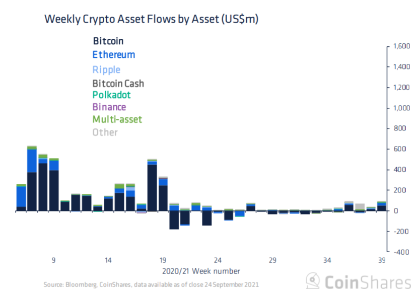 Nonostante la recente volatilità del mercato causata dalla legislazione cinese sulle criptovalute, sembra che gli investitori istituzionali abbiano considerato il crollo del mercato delle criptovalute della scorsa settimana come un'opportunità di acquisto. I dati recenti di CoinShares hanno rivelato la scorsa settimana afflussi per un valore di 95 milioni di dollari in prodotti di risorse digitali, segnando un aumento settimanale del 126%.