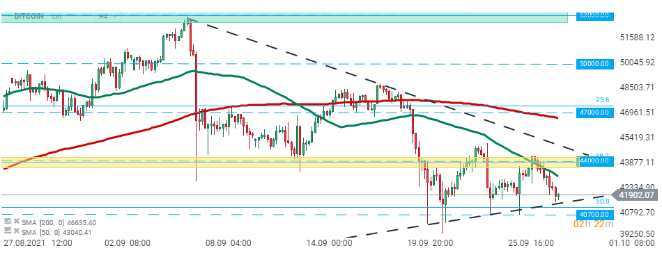 Bitcoin: il prezzo non è riuscito a rimanere sopra la resistenza a $ 44.000, che è contrassegnata dal 38,2% del ritracciamento di Fibonacci dell'ultima ondata al rialzo e il prezzo si è ritirato. Attualmente Bitcoin sta testando la linea di tendenza al rialzo che coincide con il 50% del ritracciamento. Se venisse superata, il movimento al ribasso potrebbe accelerare verso il supporto a $40,700. D'altra parte, se venisse fermato il calo, potrebbe essere lanciato un altro impulso al rialzo verso la suddetta resistenza a $ 44.000. Fonte: xStation5