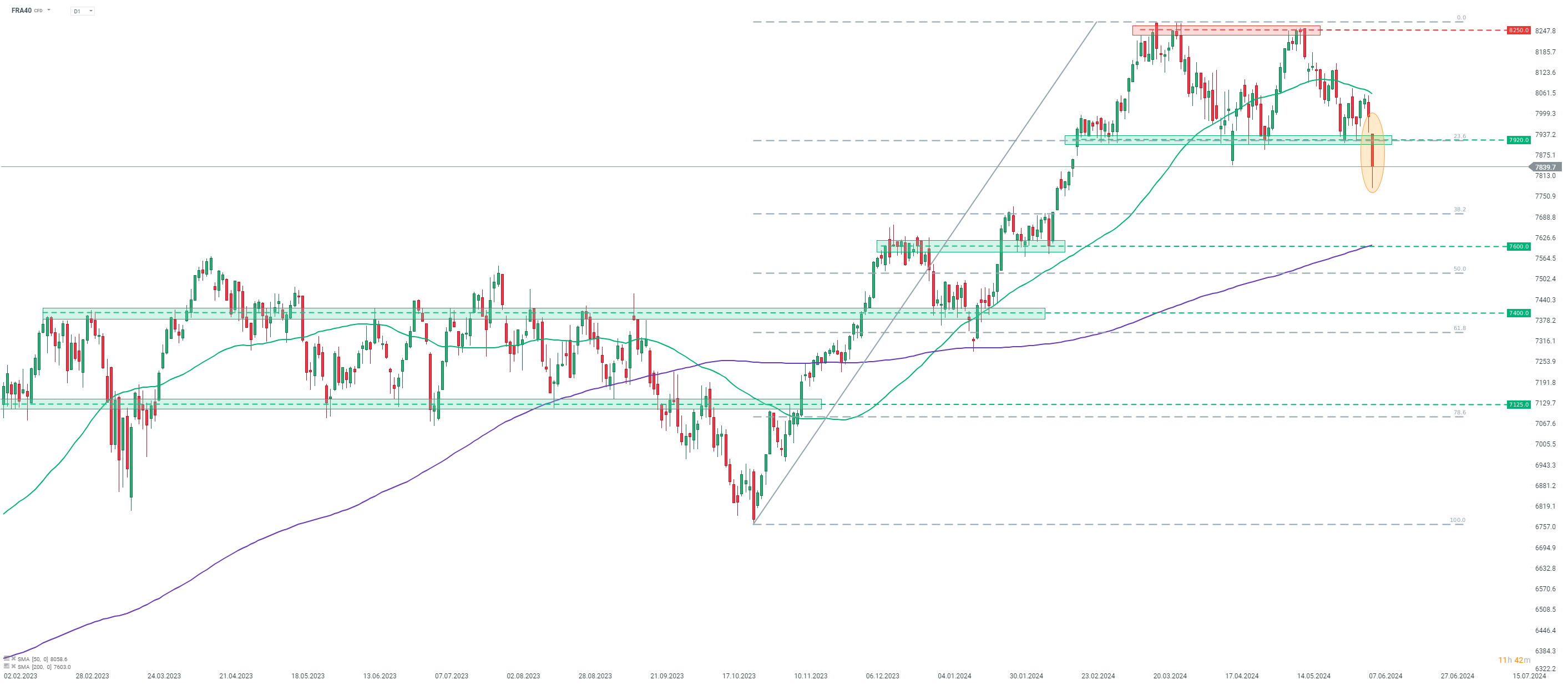 CAC40 (FRA40) crolla del 2% dopo che Macron ha indetto elezioni anticipate sulla scia della forte dimostrazione del raduno nazionale di estrema destra alle elezioni del Parlamento europeo. L'indice è crollato sotto l'area di 7.920 punti, che ha recentemente segnato un minimo per i prezzi, ed è scambiato al livello più basso in tre mesi e mezzo. Fonte: xStation5