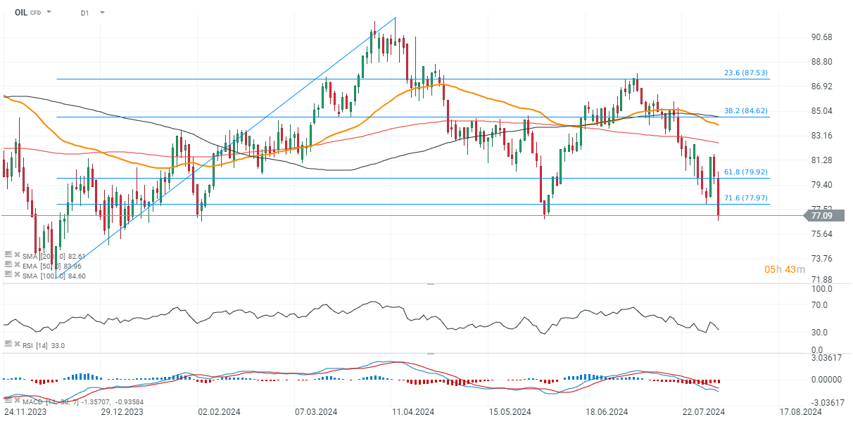 Oggi, il petrolio ripropone i minimi locali vicino al livello di 77 dollari da febbraio e giugno 2024. Scendere al di sotto del livello di 77 dollari potrebbe portare a testare i 72 dollari al barile, i minimi locali da gennaio 2024.