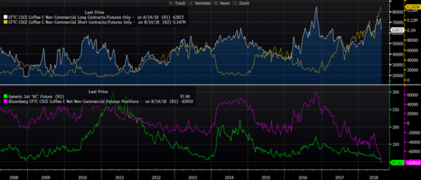Mai nella storia il caffè è stato così ipervenduto dagli speculatori. Vale la pena ricordare che il caffè è il secondo più grande mercato di materie prime del mondo in termini di volume. Fonte: Bloomberg