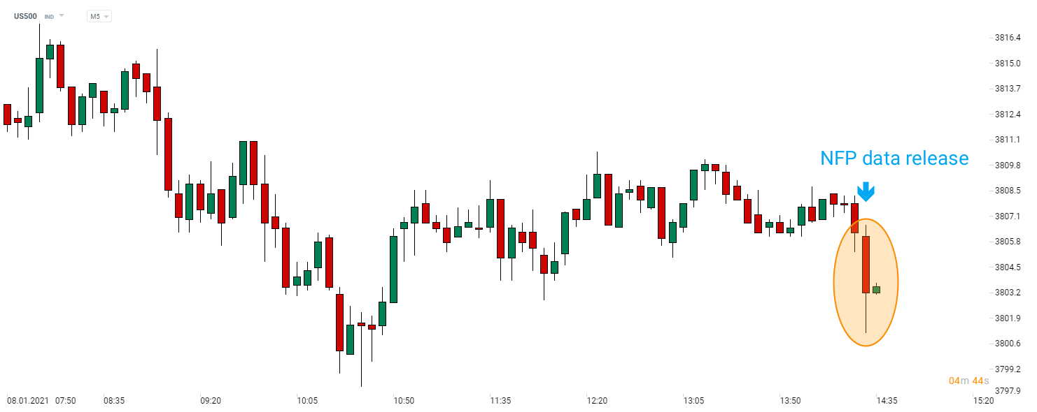 US500 si è ritirato dopo il rilascio dei dati NFP. Tuttavia, l'entità del declino è piuttosto minore poiché gli investitori si aspettano che i democratici lavorino presto su un altro pacchetto di stimoli. Fonte: xStation5