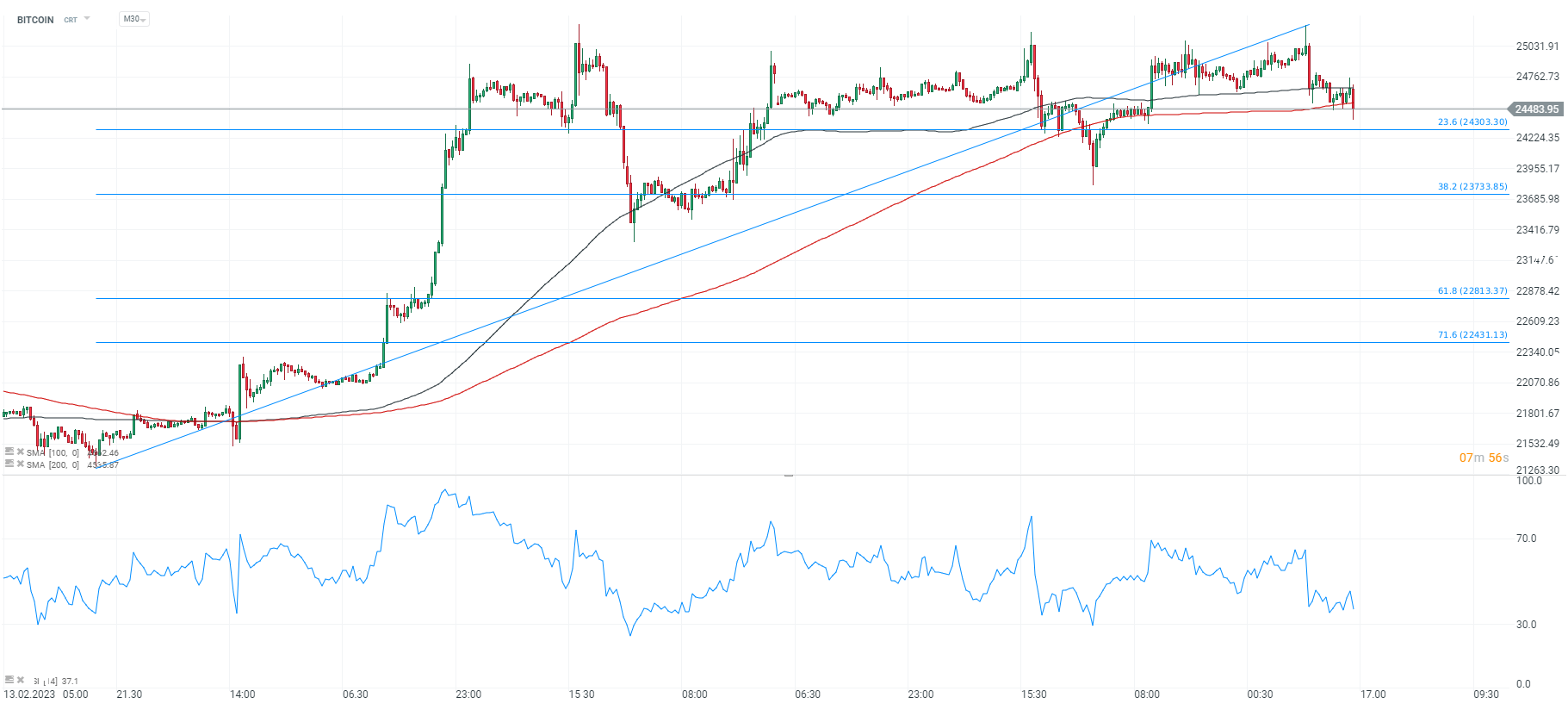 Bitcoin, Grafico M30. Il prezzo è nuovamente salito al di sopra della SMA100, ma la domanda non è riuscita a mantenere il sopravvento e sta nuovamente scivolando sotto il supporto della SMA200 (linea rossa), indicando un'offerta attiva. L'indicatore RSI mostra livelli che si avvicinano all'ipervenduto. Nel caso di un altro impulso al ribasso, il 23,6 e 38,2 del ritracciamento di Fibonacci dell'onda rialzista iniziata a metà febbraio, potrebbe rivelarsi un importante livello di resistenza. Fonte: xStation5