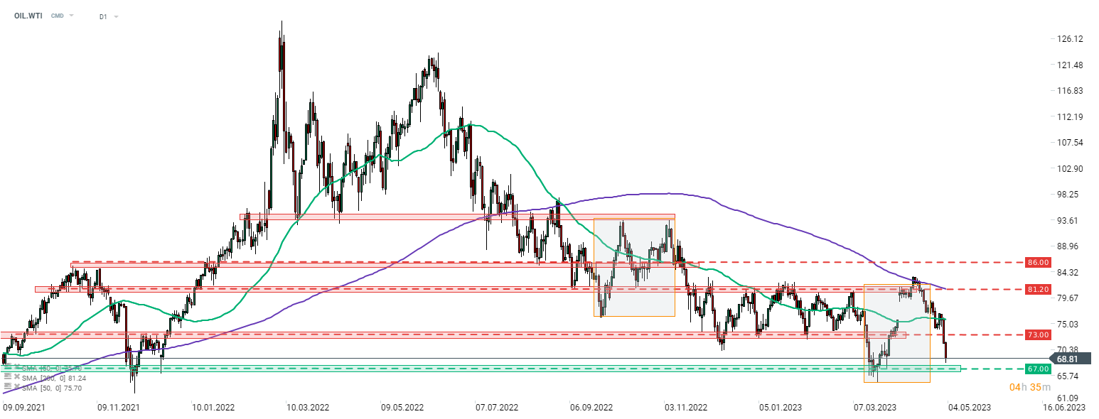 Il petrolio, così come altre materie prime energetiche, oggi si stanno ritirando. Il Brent e il WTI sono in ribasso di quasi il 4%, mentre i prezzi della benzina e del gas naturale negli Stati Uniti scendono di oltre il 4%. La mossa sembra essere guidata dalle preoccupazioni generali sulla condizione dell'economia globale, con il riemergere dei problemi bancari statunitensi che sono uno dei principali fattori di paura. A parte questo, l'OPEC+ attualmente non sembra disposta a intervenire per sostenere i prezzi, il che aumenta anche la pressione.