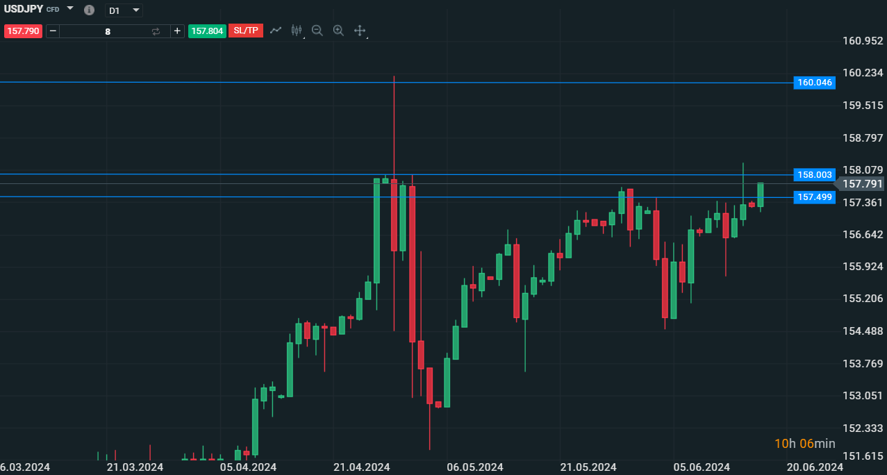Dinamica su base giornaliera di UsdJpy che gravita ancora verso i 158 - Fonte:XStation