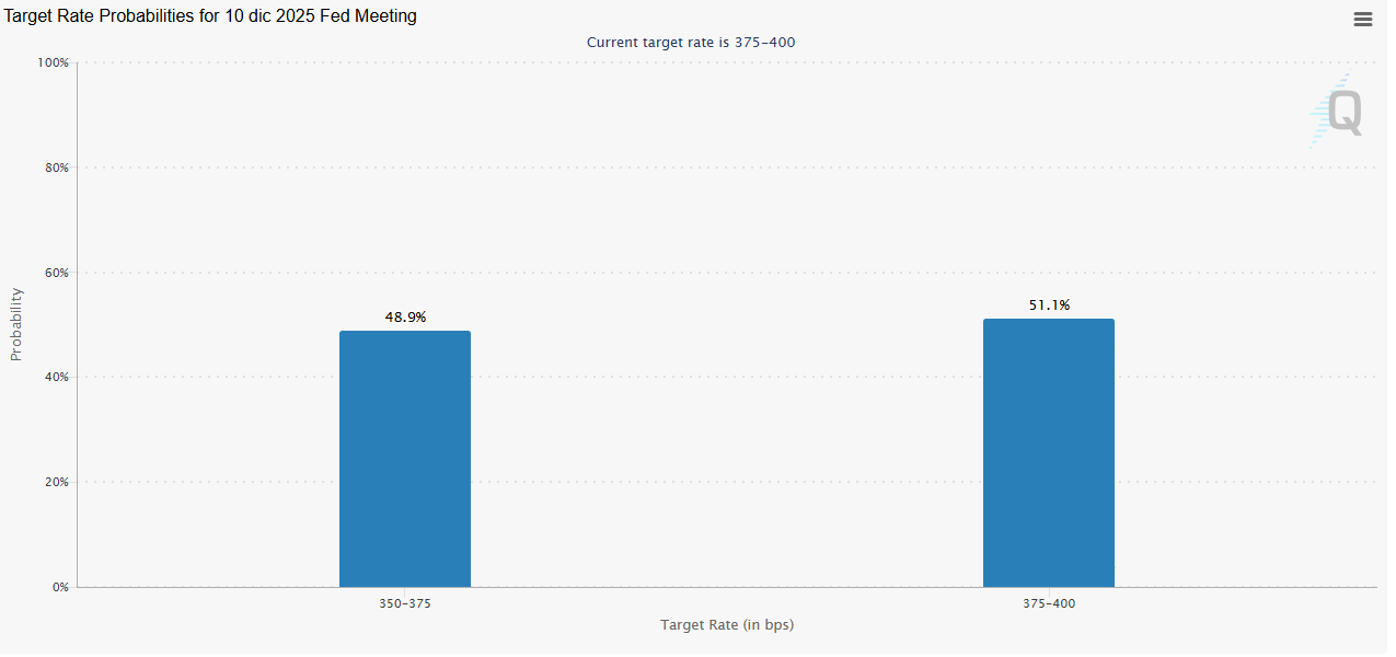 Aspettative sui tassi di interesse Fed combattute tra tassi fermi e taglio da 0,25% - Fonte: CME - Fed WatchTool