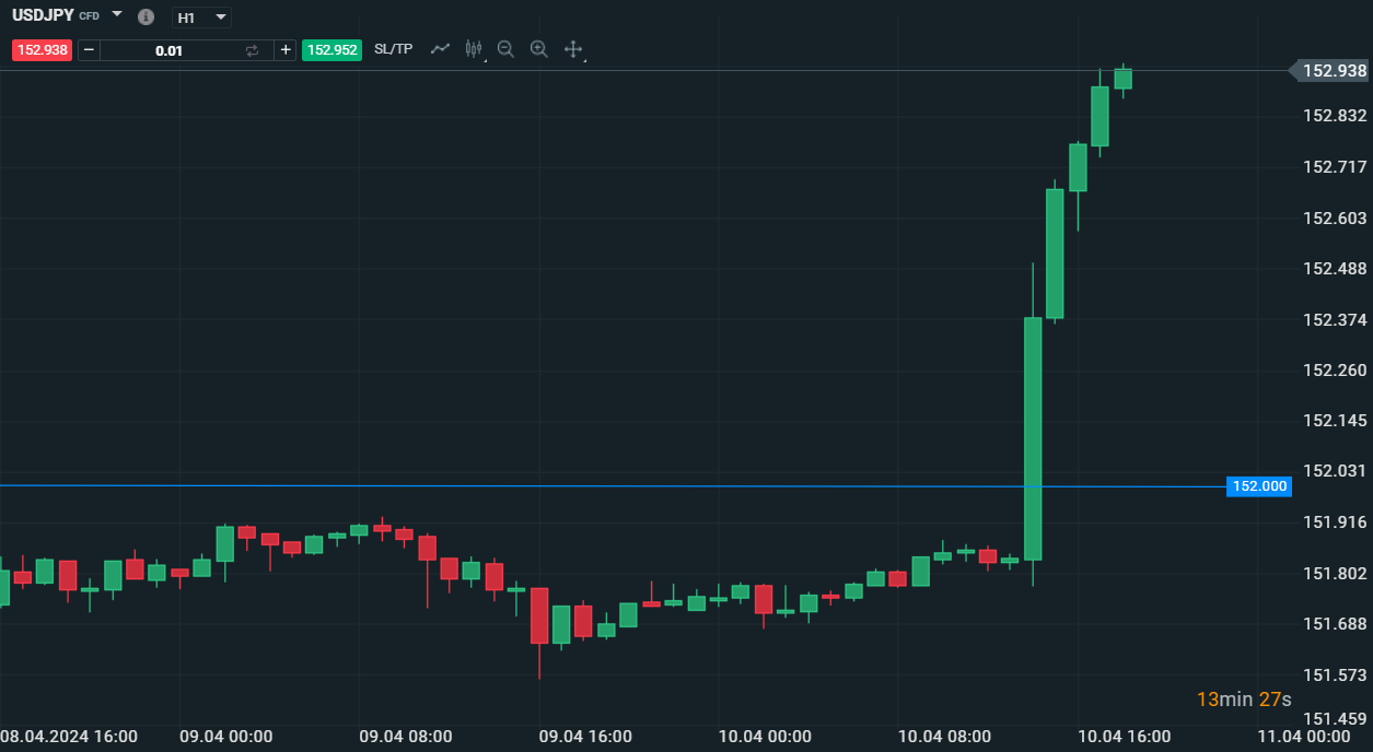 Il forte rialzo di UsdJpy che rompe i 152 dopo il dato - Fonte:XStation