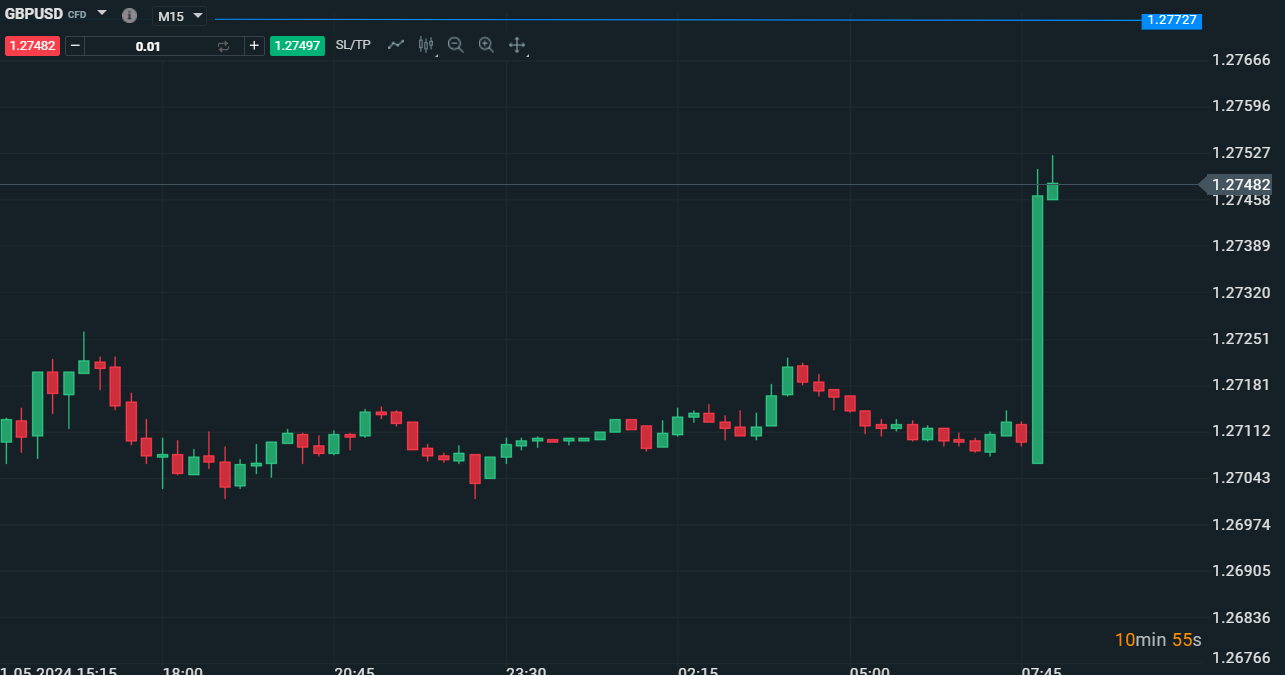 La reazione di GbpUsd all'uscita del dato - Fonte:XStation