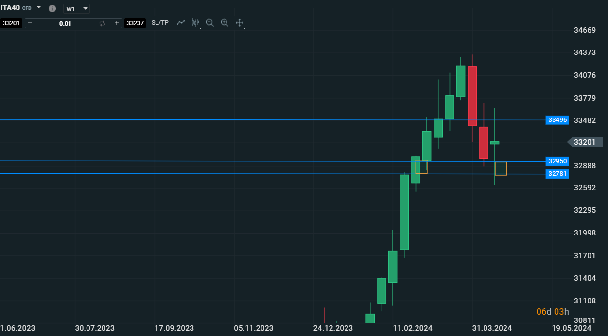 Dinamica tecnica del Ftse Mib su base settimanale - Fonte:XStation