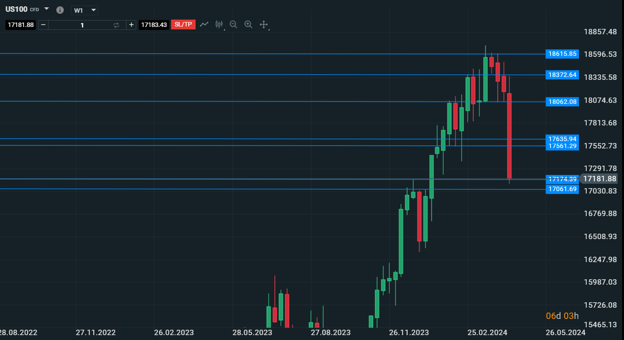 Sono ben 4 le settimane negative di Nasdaq, chiusure negative che non si vedevano dal mercato ribassista del 2022. Quella che abbiamo visto questa settimana é sicuramente un'anomalia tecnica, l'ennesima di quest'anno sui vari indici ma questa volta riguarda un movimento correttivo. Le probabilitá di un rimbalzo di breve per questa settimana sono alte in quanto i mercati si trovano tutti su livelli tecnici su base settimanale molto importanti, livelli che potrebbero essere determinanti per un rimbalzo verso la zona massimi delle scorsa settimana. Su Nasdaq area 17100-17180 é un'area importante dove potrebbe esserci una reazione in quanto fa riferimento a dei massimi settimanali visti a cavallo tra dicembre 2023 e gennaio 2024. Nel grafico in allegato é possibile notare questi livelli.