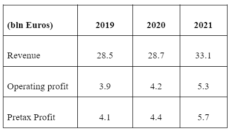 L'azienda ha aumentato le vendite e i profitti per almeno tre anni consecutivi e nel 2021 ha generato oltre 30 miliardi di euro di vendite e oltre 5 miliardi di euro di utile operativo (EBIT). L'azienda ha registrato una crescita costante dei ricavi con un margine operativo in aumento, che è anche ben al di sopra di quello dei concorrenti.