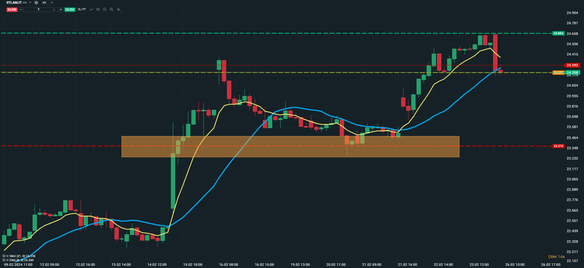 Nonostante questo annuncio il prezzo delle azioni ha iniziato la settimana sotto pressione con un calo di quasi il 2%. Stellantis (STLAM.IT) sta testando il livello di 24.25 che sta agendo da supporto dopo che il titolo ha raggiunto un nuovo massimo storico. Riuscirà a rimbalzare e a continuare il rialzo o verrà esteso il movimento al ribasso? Fonte:xStation5