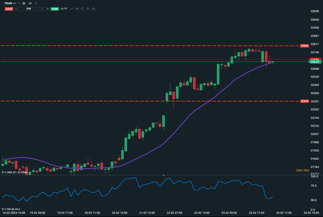 ITA40 inizia la settimana con incertezza mentre si aggira vicino ai recenti massimi (32,800) ma mostra segni di indebolimento dello slancio rialzista con l’indicatore RSI che si avvicina a livelli di ipervenduto (33.5). L’indice sta testando la media mobile 21 (linea viola) e una zona che ha brevemente mostrato segni di reazione (32670). Durante la settimana sarà sicuramente importante tenere d’occhio i dati sull’inflazione dall’europa e dagli stati uniti e potenziali grandi movimenti che potrebbero cambiare notevolmente la tendenza. Fonte: xStation5